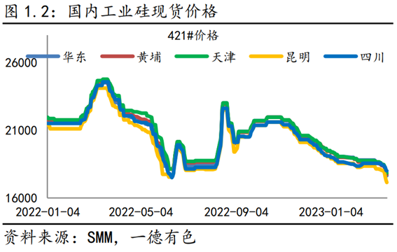 总所周知一季度受价格下跌和成本压力,西南地区出现规模性减产甚至停机检修,且复产计划均有推迟,供应端呈现北增南减的局面,因此在丰水季来临前即电价下调前,工业硅期货盘面可依托现金流成本价格逢低布局多单,但上涨缺乏动力预计空间不大。2023年预计工业硅产量400万吨,同比增长14.2%左右,2023年工业硅净出口预估63万吨,多晶硅消费大幅度提升至166万吨,有机硅行业预估消费量109万吨,全年国内消费350万吨,增速28%,全年紧缺13万吨,不过由于多晶硅产量释放周期长,因此预计2023年上半年工业硅仍将面临压力。