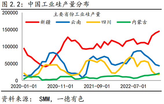 2022年12月22日工业硅商品期货成功上市,在春节前消费疲软的基本面情况下上市前两个交易日内工业硅现货价格从19700元/吨下跌至17000元/吨,但现货市场表现平稳回落报价并未跟随期货价格波动,期货价格宣泄情绪后开始反弹。但新进期现贸易商的参与打破了原有工业硅行业的贸易模式及现货市场供需格局,春节后新进贸易商现货市场积极采购缓解了厂家的销售压力,现货市场出现为期一周短暂的反弹。但终端实际消费除了多晶硅需求平稳外,有机硅及铝合金仍处于放假期间采购积极性不高,尤其有机硅行业依旧面临全行业亏损的情况,复产复工积极性不高。在弱消费显示的情况下,期现货价格同步下滑,且由于期现贸易商的抛售使得价格出现了踩踏行为,3月底期货价格跌破16000元/吨,跌破部分企业生产现金流成本,南方地区工厂出现新一轮的减产行为,且复产计划频频推迟。西南供给端收缩明显,但西北新增产能投放如常,造成一季度全国产量大幅度走高,对市场价格形成压力。