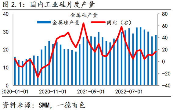 2023年1-2月份中国工业硅产量55.48万吨(不包含97硅和再生硅),累计同比增长13.7%,预计3月份国内工业硅产量30-31万吨,4月产量约29万吨,日均产量较2月份减少5%。2023年新增产能或达到123.5万吨,全年预计产量400万吨,同比增长14.2%。