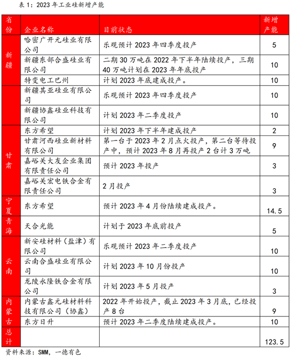 据统计2023年一季度新增产能10-15万吨,二季度新增产能30万吨,三季度新增产能50万吨,四季度新增产能10万吨,由于投产后需要2-3个月出产品,产品爬坡期为3-6个月,因此下半年多晶硅产量贡献较多。