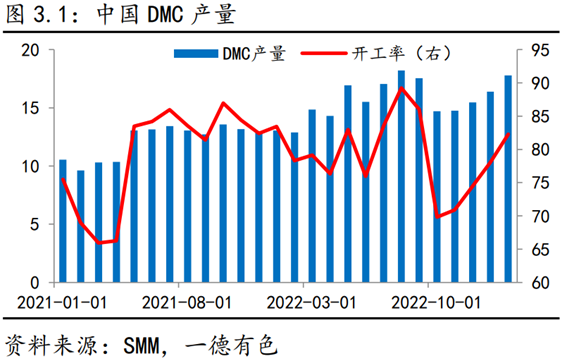 据统计2023年1-2月份中国DMC产量34.18万吨,累计同比增长31.8%,2022年底由于下游消费疲软,有机硅企业进行主动的检修减产,开工率及产量均出现了明显的下滑。2023年春节后,随着疫情的放开市场情绪的好转,终端消费复苏有机硅行业成本库存压力减小,价格有所回升,但涨势并未持续,小企业受迫于生存压力出现降价卖货的情况。行业洗牌依旧持续,新疆合盛持续投产,个别小企业负荷仍在降低,不过市场整体货源供应持续增加。