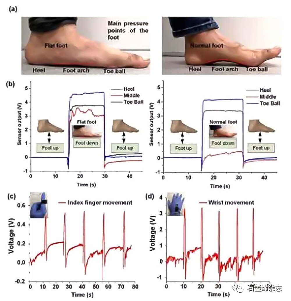 7. 石墨烯- PDMS泡沫传感器在足部解剖和人体运动监测中的应用:(a)比较低足弓/扁平足与中等足弓生物力学效率的图像;(b)比较两种不同足型获得的SSA压力响应;(c)传感器对食指轻弹的响应;(d)传感器对手腕轻弹的响应。