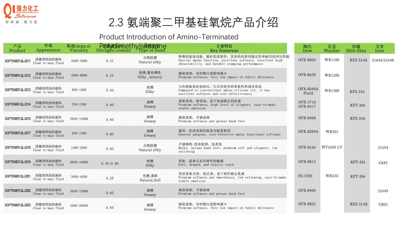 氨当量也常用于表示氨基含量,指氨基改性硅油分子中 1 个 N 原子相当的摩尔质量(氨当量=氨基改性硅油摩尔质量/分子中 N 原子数) ,所以氨当量越大,则相应硅油所含氨基的数目就越少。