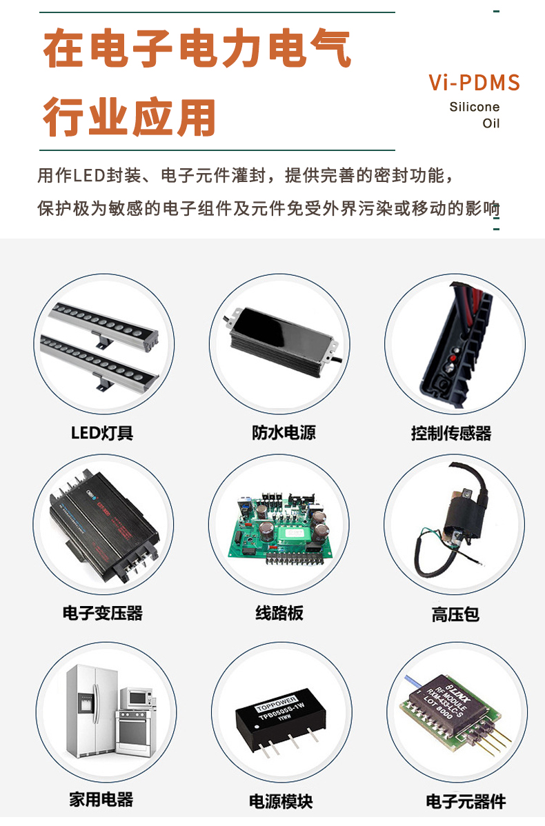 乙烯基硅油灌封可以提供完善的密封功能,保护极为敏感的电子组件及元件免受外界污染或移动的影响。这一点对于保证许多电子产品的长期稳定及性能具有重要意义。此外,乙烯基硅油不会腐蚀、不会自燃,符合电子产品生产及制造中最为苛刻的安全及纯度要求。