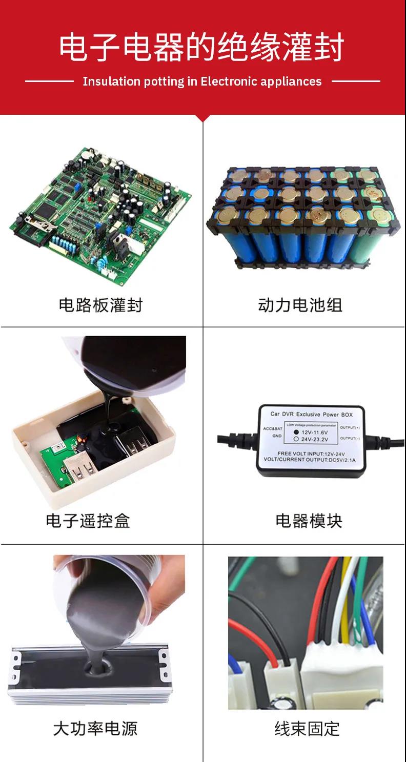 电子产品在制造完成之后,往往需要再进行―道灌封工艺,使其与外界隔绝,以此提高电子产品的抗震能力、防水性能,防止电子元器件受到自然环境的侵蚀,延长电子产品的使用寿命。目前用于灌注在电子元器件内的灌封材料多种多样,使用较多主要还是:聚氨酯材质、环氧树脂材质和有机硅材质。其中使用最多的还是有机硅材质的灌封胶,因各种优良的特性而被广泛应用。