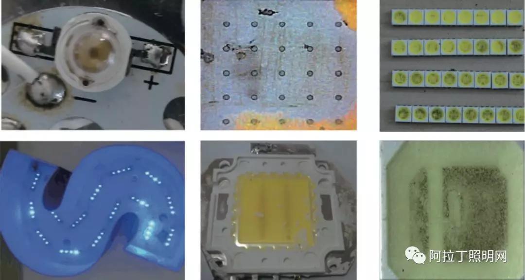 从图一可以看到,不论灯珠形式,不论何种灯具,硫化发黑和卤素发黑是LED终端经常会遇到一个问题,通常是LED支架反射银层与环境中硫元素或者卤素发生化学反应引起的外观发黑,这种发黑通常不可逆,造成非常大的光衰。
